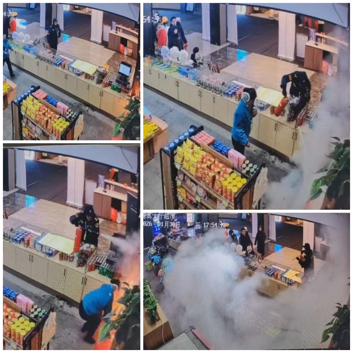 (上图:保安队员张胜及时处置突发火情)