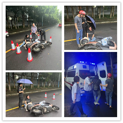 2023年7月28日下午,路人骑车经过天合光能总部时由于雨天路滑,不慎在厂区门口摔倒,我公司驻天合光能总部门岗保安陈五珠同志看到后立即赶到现场,做好秩序维护工作,发现车主受伤严重,无法起身站立,立即拨打120急救。随后陈五珠同志在等待救护车过程中为伤者递上纸巾擦拭、撑伞挡雨,并安抚好伤者情绪,直到将伤者护送上车。