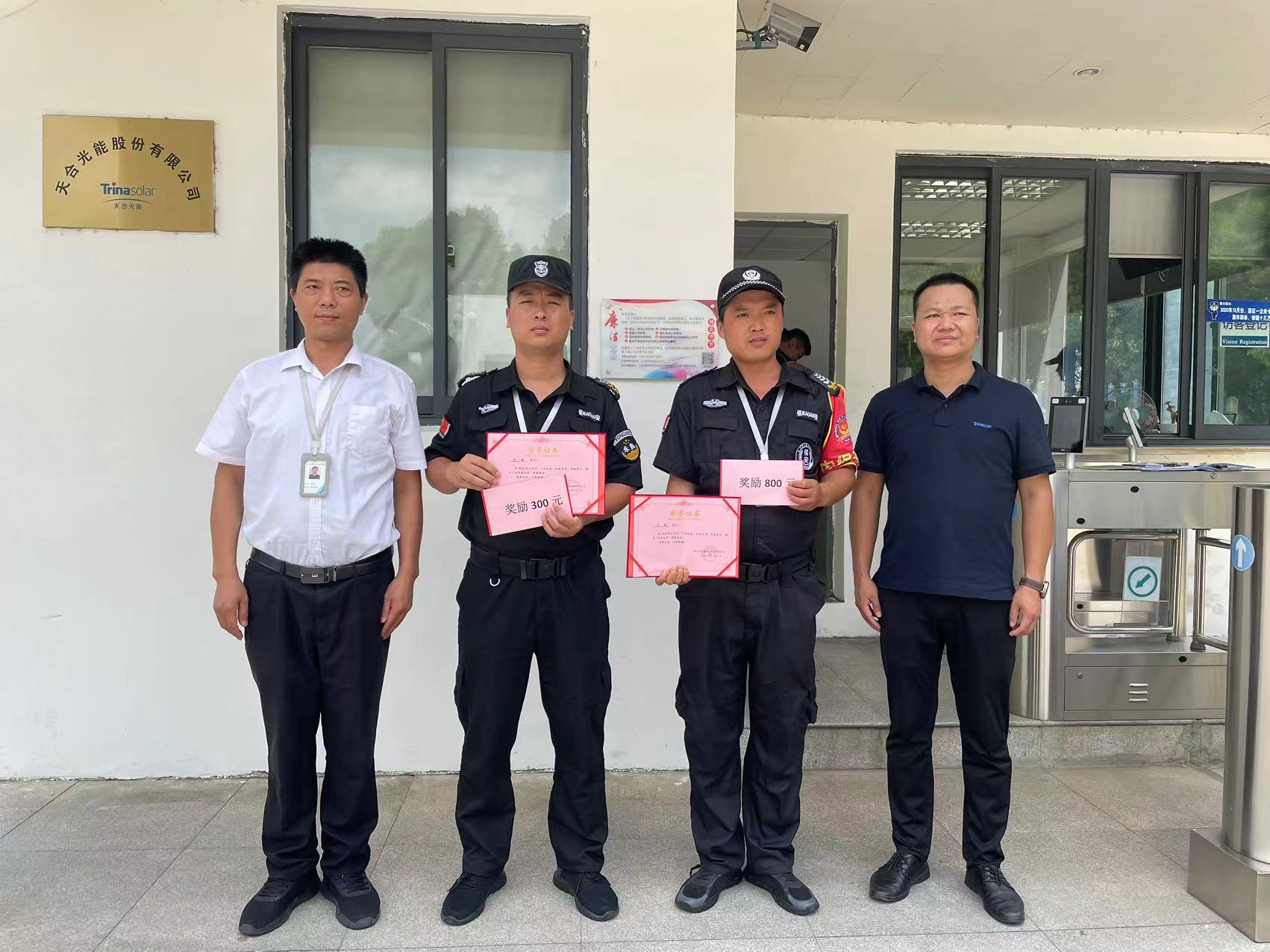 天合光能安保部领导对我公司保安队员的尽心尽责,恪尽职守提出表扬,并给予500元奖励。我公司在此基础上增加600元,分别给予给陈超同志800元、王建300元奖励。以此鼓励队员陈超同志工作认真负责、队长平时的尽心引导和培训。认真履职维护客户单位人身和财产安全,这种高度自觉性和责任心,值得我们每一位员工去学习。